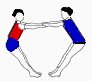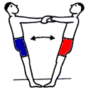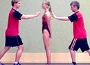 Zwei Schüler/innen müssen in verschiedenen Körperpositionen und Griffhaltungen das Gleichgewicht finden und damit spielen.Bei Übung C und D muss darauf geachtet werden, dass der Rücken gerade ist und dass Oberschenkel und Unterschenkel einen rechten Winkel bilden.