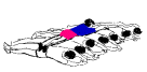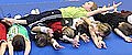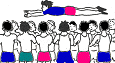 8-10 Schüler liegen eng aneinander, ein weitere Schüler legt sich mit Bauch oder Rücken auf diese Gruppe. Auch er muss stark angespannt sein. Durch seitliches Rollen der Untergruppe wird nun der obere Schüler ohne sein Zutun transportiert.Video mobilesport