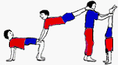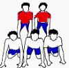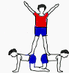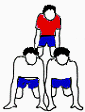 Zwei Schüler bilden die Basis, der obere Schüler steht auf den Oberschenkeln und wird mit dem Handgelenksgriff gehalten.