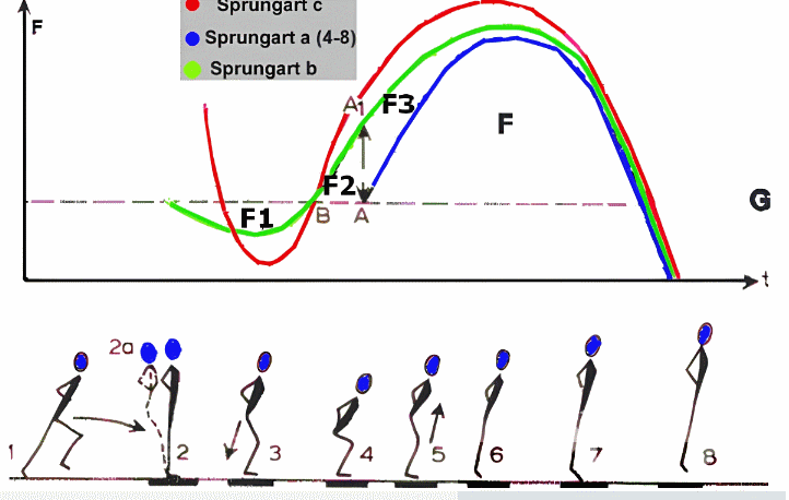 Damit ist in der tiefsten Lage des Körperschwerpunktes, also zu Beginn der eigentlichen Sprungbewegung (A), bereits eine positive Kraft, die sogenannte Anfangskraft vorhanden.