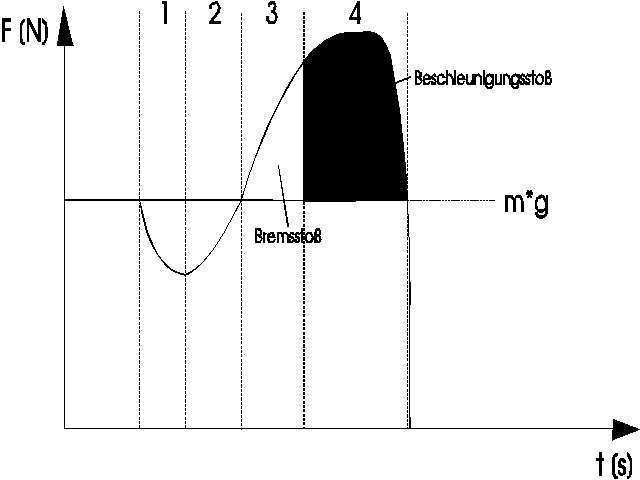 Der Zeitpunkt der Streckbewegung ist in der Kraft-Zeitkurve nicht direkt ermittelbar. Rechnerisch läßt er sich aber bestimmen. Dazu muß zunächst der Kraftstoß der Phasen 1 und 2 bestimmt werden. Anschließend wird der Punkt gesucht, an dem die Fläche der Phase 3 genauso groß ist wie die Summe der Phasen 1 und 2. Die Phasen 1 und 2 charakterisieren den Kraftstoß der für die abwärts gerichtete Beschleunigung verantwortlich ist und dieser muß genauso groß sein wie der Kraftstoß zur Abbremsung der Abwärtsbewegung (Bremsstoß).