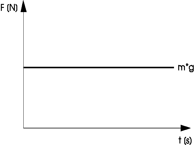 Wenn wir die mit der Waage gemessene Kraft in ein Kraft-Zeitdiagramm eintragen wollen, müssen wir die Kraft z.B. innerhalb von mehreren Sekunden mehrmals ablesen und dann in ein Diagramm eintragen. Für den obigen Fall des ruhigen Stehens auf einer Waage ergibt sich die folgende Kurve: