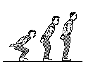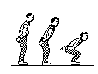 Wir wählen für diese Aufgabe eine einfache Beugebewegung der Beine, so daß die stehende Person in die Knie geht und in einer Hocke stehen bleibt. Die folgende Strichzeichnung stellt die Bewegung noch einmal dar und kann später zur Zuordnung zum Kraft-Zeitverlauf benutzt werden.