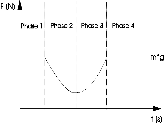 Die Vertreter der zweiten Kurve werden bezüglich der Abbremsbewegung im dritten Punkt anders argumentieren. Sie werden darauf hinweisen, daß eine Abbremsbewegung über das ursprüngliche Gewichtskraftniveau hinaus ansteigen muß, um eine Abbremsung der Bewegung zu erreichen. Daher ist dieser Verlauf in Phase 3 über das Gewichtskraftniveau hinausgegangen.