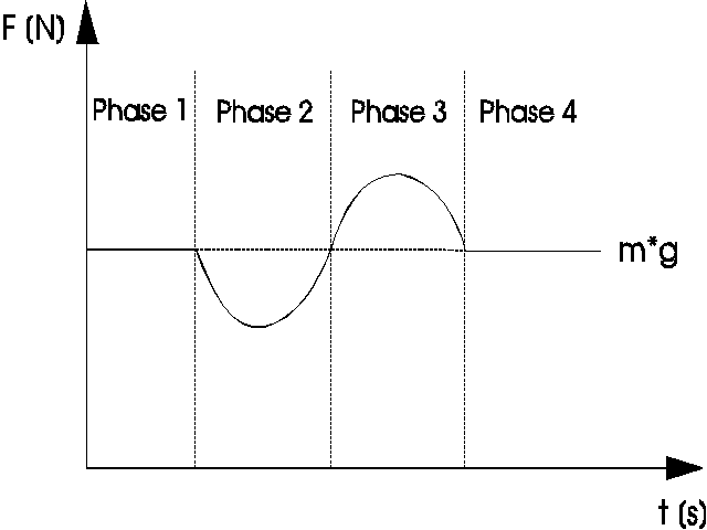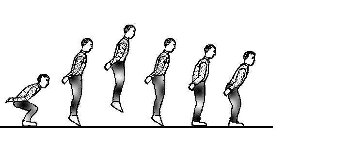 Abb. 11 Countermovement JumpWir sammeln auch hier wieder Vorschläge zum Kraft-Zeitverlauf. Aus den Kenntnissen zu den vorher behandelten Aufgaben müßten die Schüler in der Lage sein, den Verlauf korrekt anzugeben. Da diese Bewegung nur noch schwer über die Waage experimentell zu beobachten ist, sollte im Anschluß ein real gemessener Verlauf betrachtet werden. Interessant ist an diesem Beispiel außerdem die Möglichkeit, einzelne Bewegungsphasen der Kraft-Zeitkurve zuzuordnen. Diese Aufgabe sollte unter Nutzung der obigen Bildreihe gemeinsam gelöst werden.