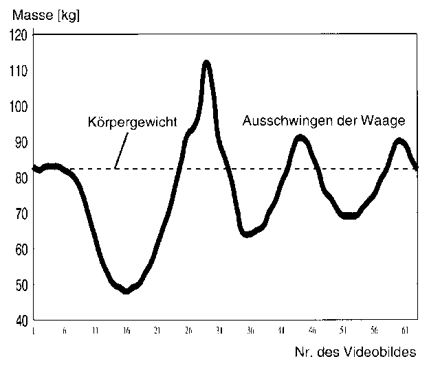 Natürlich sind derartige Kraftmessungen nicht mit den Ergebnissen von biomechanischen Kraftmeßplatten vergleichbar. Quantitative Ergebnisse können wir nicht ermitteln, da z.B. Nachschwingungen der Waage eine Auswertung erschweren. Zu beachten ist, daß Nachschwingungen, die nach Bewegungsende erfolgen nicht durch aufgebrachte Kräfte entstehen, sondern durch die Trägheit der Anzeigeinstrumente. Sie müssen daher unberücksichtigt bleiben und die Schüler sollten auch auf dieses Problem hingewiesen werden. Bei einigen Waagen kann man durch einen nachträglich eingebauten kleinen Abbremsmechanismus das Nachschwingen eliminieren. Je nach handwerklichem Talent kann hier eine Waage entsprechend baulich verändert werden. Trotz all dieser Bedenken ermöglichen Waagen die anschauliche Darstellung, wie Kraft-Zeitverläufe ermittelt werden können. Darüber hinaus ergibt sich durch das experimentelle Vorgehen im folgenden eine größere Motivation der Schüler als bei einer rein theoretischen Behandlung des Themas. Sollte man das Glück haben, daß man auf eine Kraftmeßplattform einer Universität zurückgreifen kann, sind natürlich qualitativ erheblich bessere Messungen möglich.