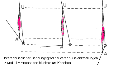 Betrachtet man Ursprung- und Ansatzstelle eines Muskels am Knochen bei verschiedenen Winkelstellungen des Gelenks erkennt man, dass die Strecke U-A bei maximal gewinkeltem Gelenk am kürzesten, bei gestrecktem Gelenk am längsten ist. Entsprechend verhält sich der Dehnungszustand des zwischen U und A ausgespannten Muskels.