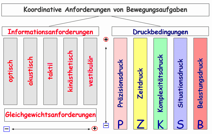 Daraus können dann Inhalte für ein Koordinationstraining abgeleitet werden.Durch entsprechende Aufgaben im Lernprozess können Akzente gesetzt werden. Überforderungen können durch Variation der Druckbedingungen (s.u.) vermieden bzw. spezielle Fähigkeiten besonders geschult werden.