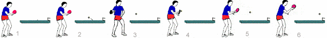 1 Ausgangsstellung / Erwartungshaltung Grundstellung offen ca. 1m hinter der Platte 2/3 Ausholphase (>Schlagphase) Schulterdrehung, Rückführung des Schlägers (gerade) 3/4 Schlagphase Arm- und Körperbewegung nach vorn, Treffpunkt seitlich vom Körper (Schlägerblatt leicht geschlossen) 5/6 Ausschwungphase Ausschwingen bis Kopfhöhe