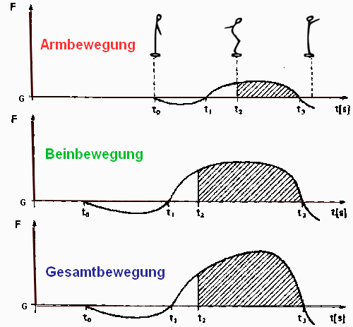 der Beine und die Schwungbewegung der Arme werden beide Impulse für