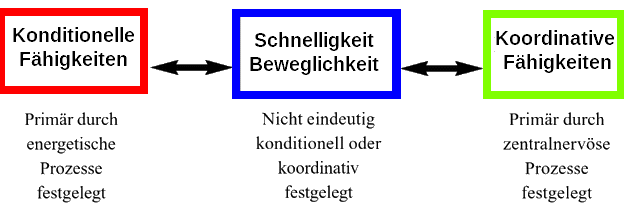 Die motorischen Grundeigenschaften stehen in wechselseitiger Beziehung zueinander und treten als sportspezifische Anforderung oft in Kombination auf (z.B. Schnellkraft, Schnelligkeitsausdauer etc.) und hängen auch mit koordinativen Aspekten zusammen. Beweglichkeit wird heute meist nicht mehr eindeutig den konditionellen Fähigkeiten zugeordnet, da koordinative Aspekte eine wichtige Funktion haben (vgl. Meinel/Schnabel 1998, S. 206).