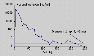 Der Nachweis einer Anwendung von Nandrolon und seinen Vorhormonen in oraler Form ist bis zu einer Woche und länger möglich. Die folgenden Abb.5 und 6 sollen verdeutlichen wie lange der Metabolit Norandrosteron nach oraler Applikation im Urin bestimmt werden kann. Die Konzentrationswerte von Norandrosteron im Urin können in den ersten Stunden nach Einnahme einer Tablette mit einer im Handel üblichen Dosierung von ca.100 mg Werte von weit über 10.000 ng/ml Urin erreichen.