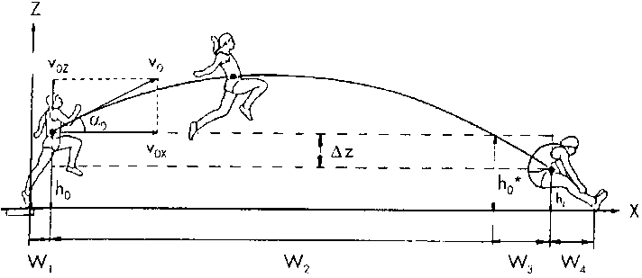 Ziel des Absprungs ist die Ansteuerung einer maximalen symmetrischen Flugbahn (w2) durch die optimale Abfluggeschwindigkeit (vo) - sie ist ein Ergebnis des aktiven Aufsetzten des gestreckten Sprungbeins.