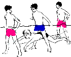 Eine Gruppe (4-8) steht mit Abstand von ca. 1 Metern hintereinander. Der jeweils letzte taucht durch die gegrätschten Beine der ganzen Gruppe hindurch.