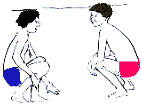 Eine Strecke muss gemeinsam zurückgelegt werden, z.B. an den Händen gefasst oder die Hände des einen Partners greifen die Füße des anderen etc.