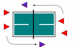 Kreuz (von rechts). Nach dem Schlag laufen die Spieler/inen im Gegenuhrzeigersinn auf die andere Seite.