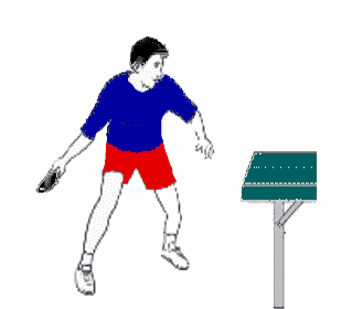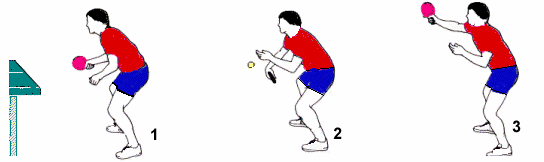 Beim Topspin verläuft die Bewegung von unten hinten nach vorne oben, wobei der Ball im oberen Teil des Schlägerblattes getroffen (angerissen) wird, dem Ball wird eine Vorwärtsrotation verliehen. Arbeitskarte mit Bildreihe und Bewegungsbeschreibung